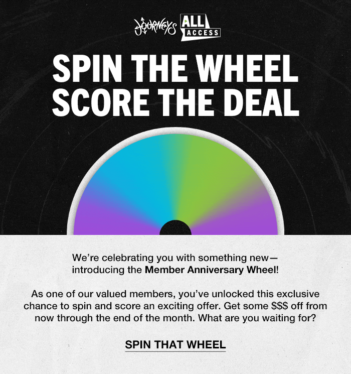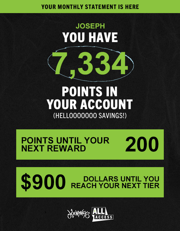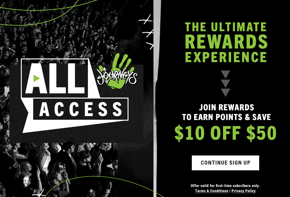 For the launch of Journeys’ first loyalty program, Journeys All Access, my team and I created the initial branding and assets. The visuals tapped into Journeys’ love for music—energetic, edgy, and bold. Since then, I’ve designed creative for sweepstakes, promos, and rewards that keep members excited and engaged.